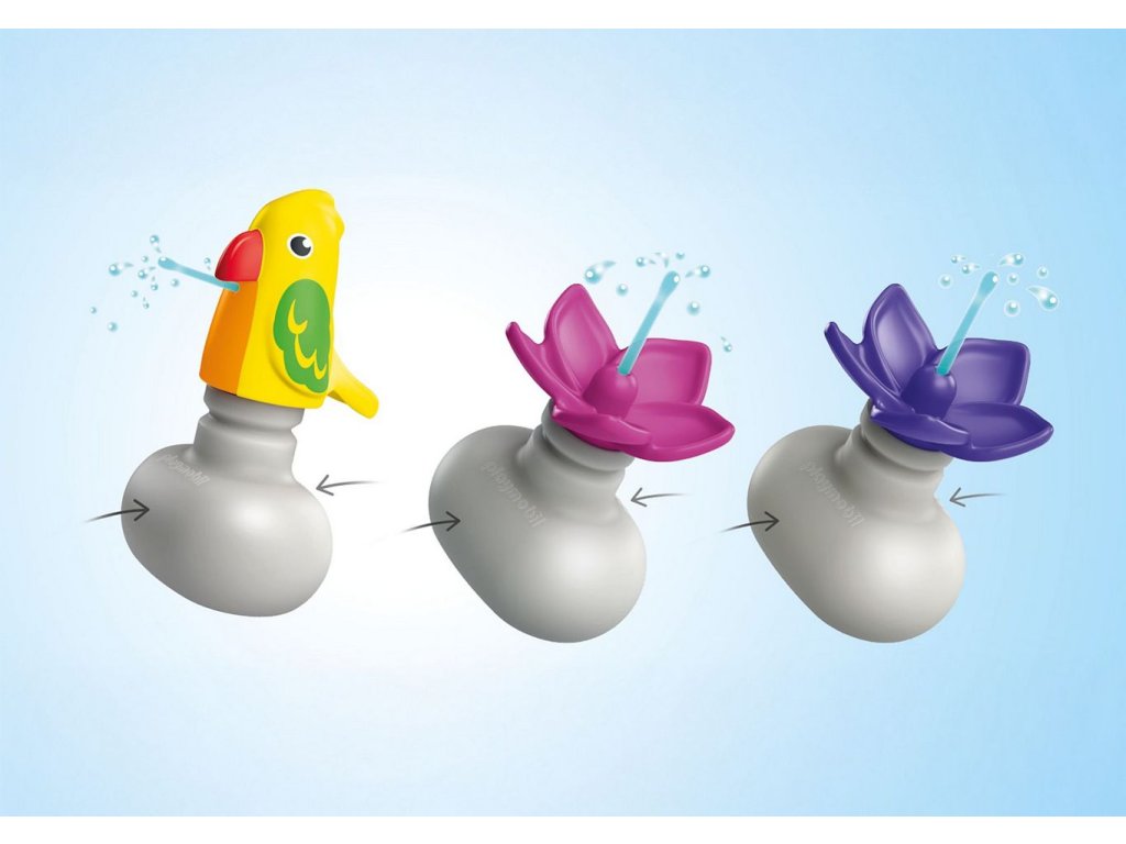 Legrace ve vaně s vodním měchem, který se může přidat ke květině nebo papouškovi a pak lze stříkat vodu.