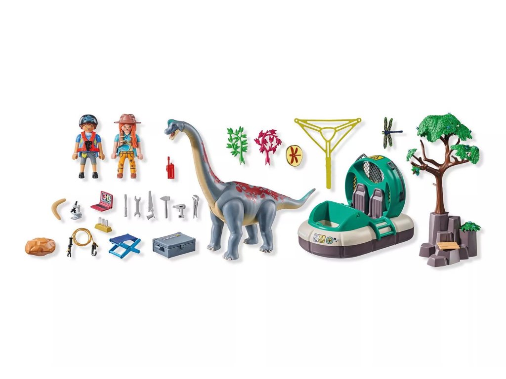 Sada obsahuje dvě postavičky vědců, Brachiosaura, vznášedlo, skálu se stromem a další vzrušující doplňky pro skvělou zábavu s dinosaury.