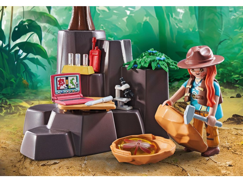 Obsahuje: 1 muž, 1 žena, 1 brachiosaurus, 1 vážka, 1 skála se stromem, 1 vznášedlo, 1 provaz, 1 nástavec s vrtulí, 1 sada nářadí, 1 mikroskop, 3 zkumavky, 1 držák na zkumavky, 1 skládací židle, 1 bumerang, 1 vysílačka, 1 notebook, 6 větví, 1 jantar, 2 poloviny kamene, 1 dřevěná deska, 1 kufr, 1 háček, 4 adaptéry, 1 strom s korunou, 1 větev, 3 listy, 2 rostliny, různé květiny