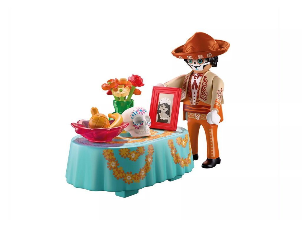 Na barevném, svátečně vyzdobeném stole je naaranžováno lahodné ovoce, typické oranžové květy afrikánů, malovaná lebka a fotografie zesnulého.
