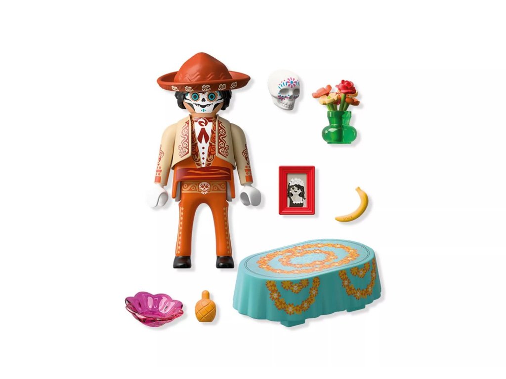 Obsahuje: 1 muž s kloboukem, 1 stůl s ubrusem, 1 lebka, 1 váza s květinami, 1 mísa s ovocem, 1 rámeček s fotkou