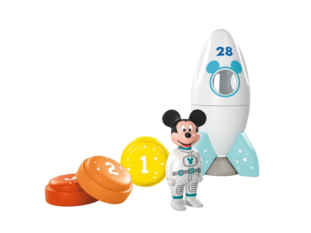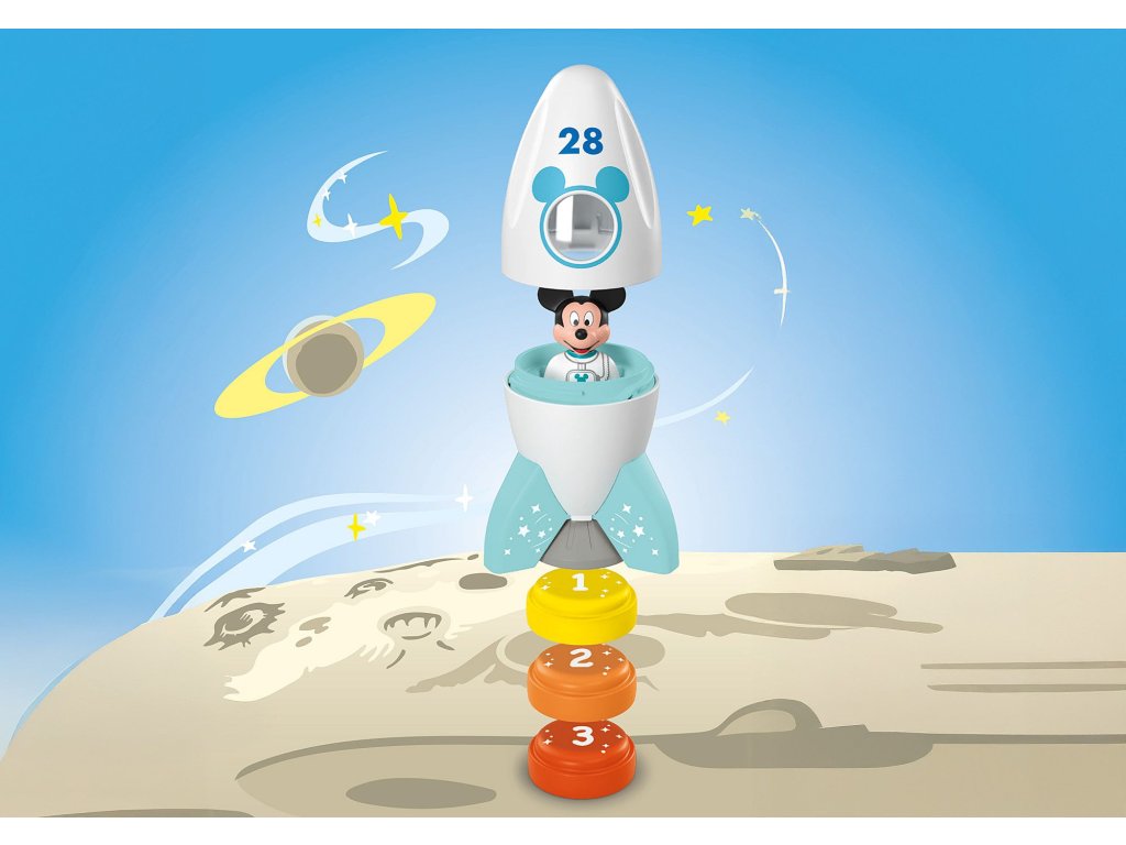 Mickey Mouse s raketou a barevnými kameny s čísly pro odpočítávání startu.