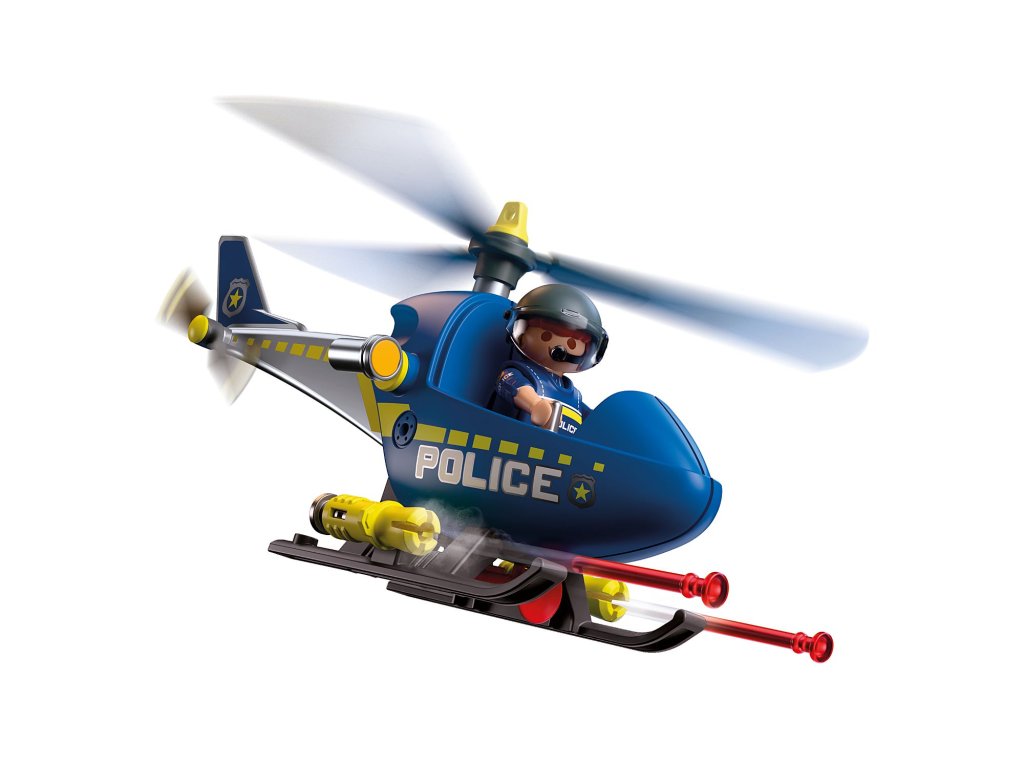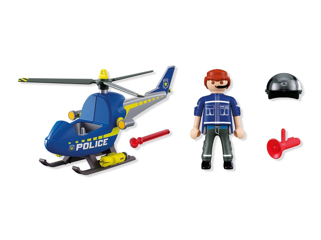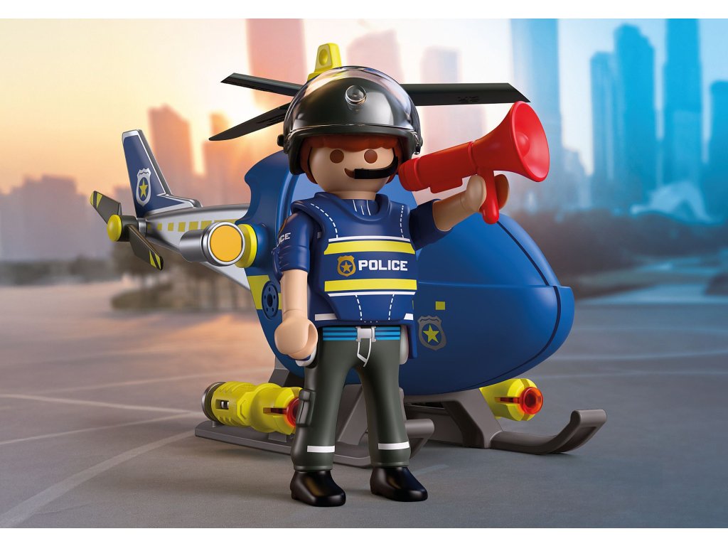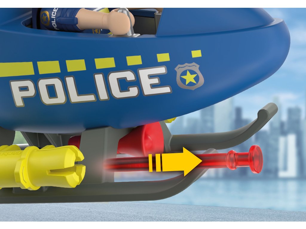 Obsahuje: 1 policista, 1 helma, 1 vrtulník, 2 kanóny, 3 projektily, 1 megafon
