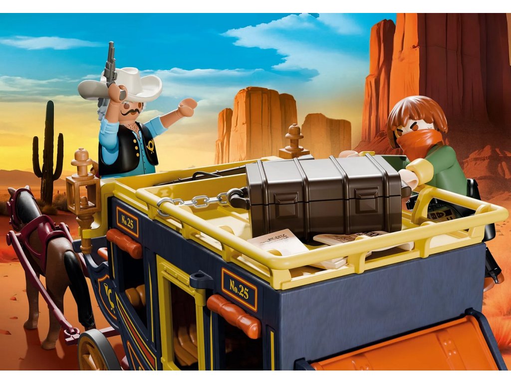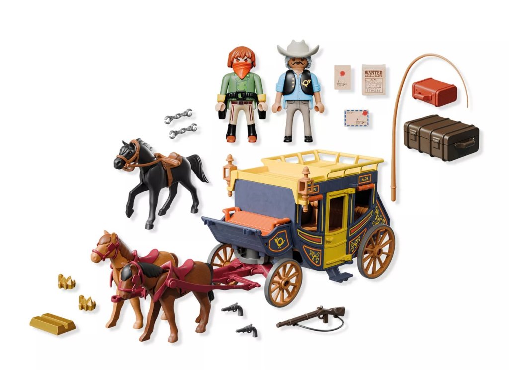Sada obsahuje postavičky kočího a bandity, dostavník, koně a množství doplňků, jako je zlato, zavazadla, dopisy, pouta, zbraně a plakát s hledaným.