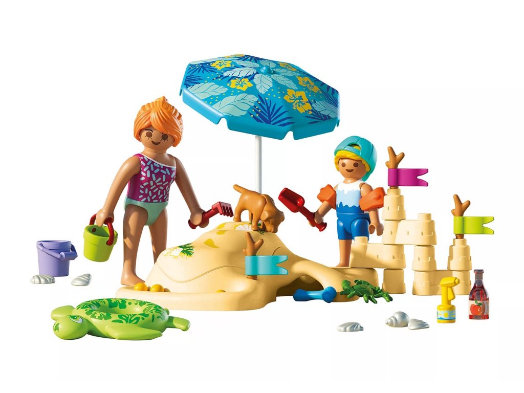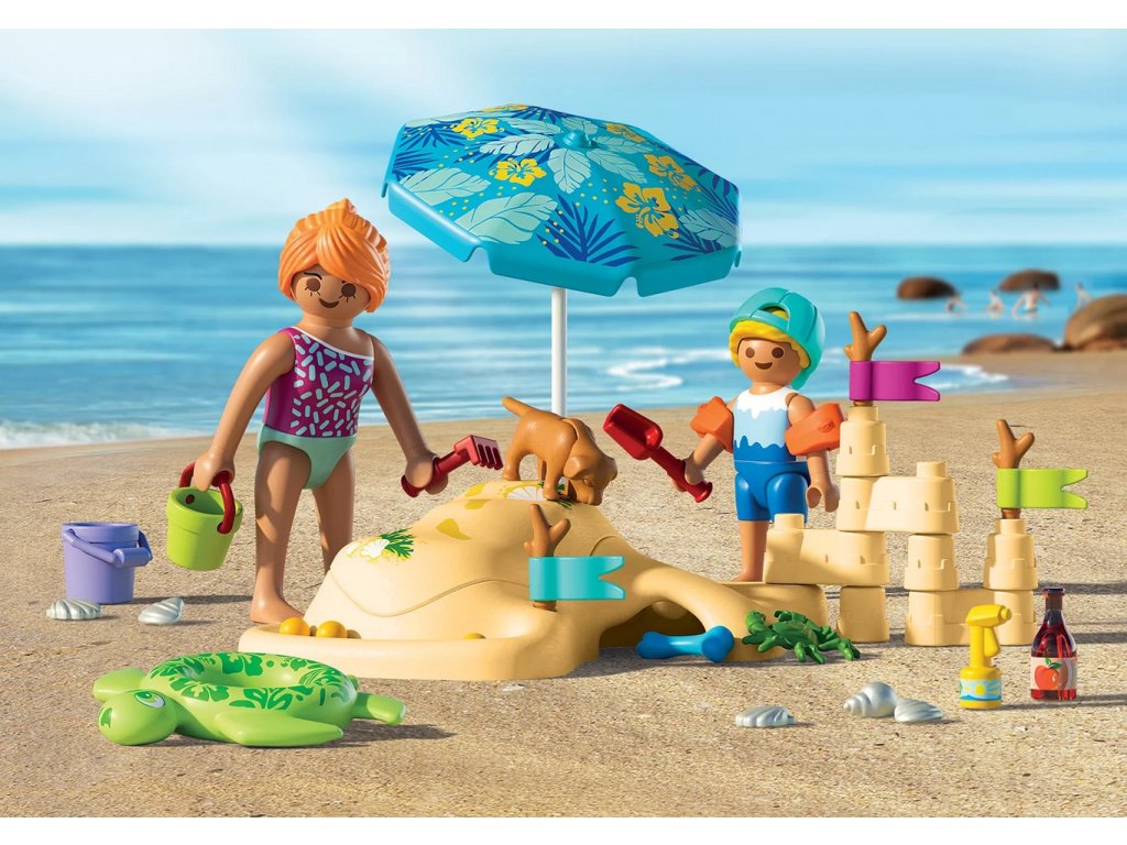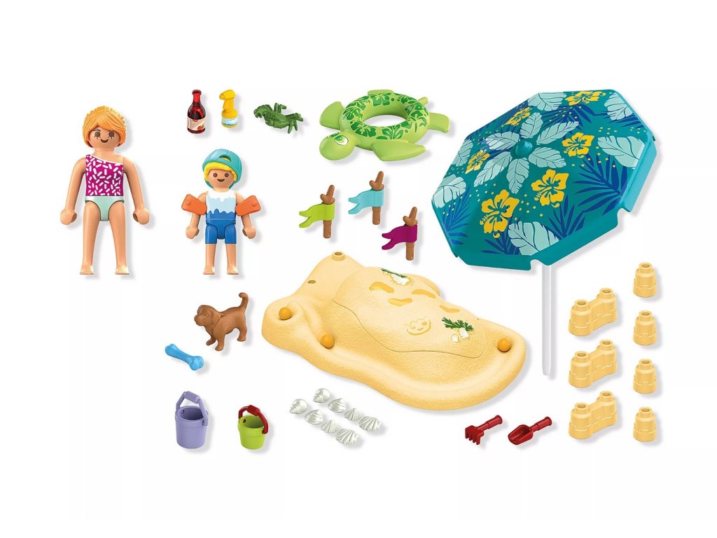 Obsahuje: 1 žena, 1 chlapec s čepicí, 1 pes, 1 krab, 1 plážová podložka s odnímatelným víkem a hrady z písku, 1 slunečník, 3 praporky na větvičkách, 3 kuličky, 1 sada mušlí, 1 láhev na pití, 1 opalovací krém, 1 kbelík s lopatkou a hrabičkami, 1 plavecký kruh a rukávky
