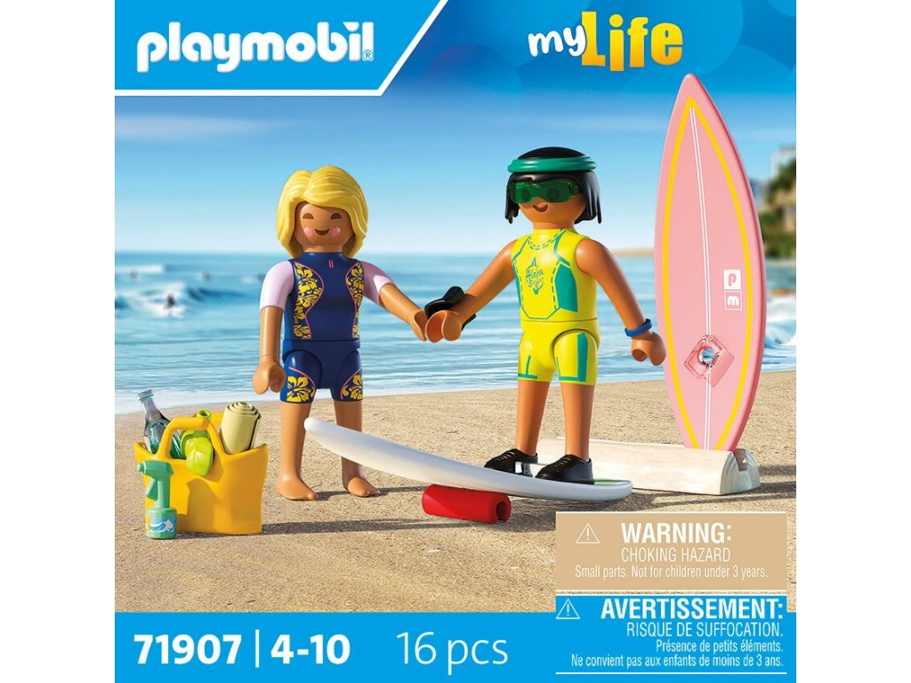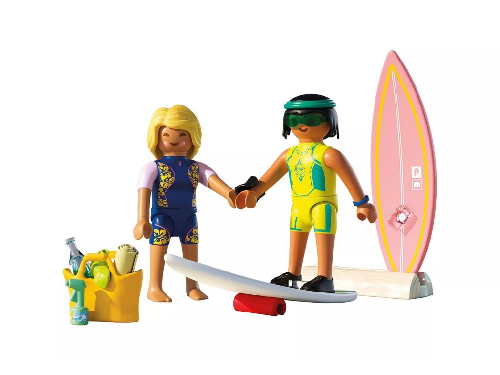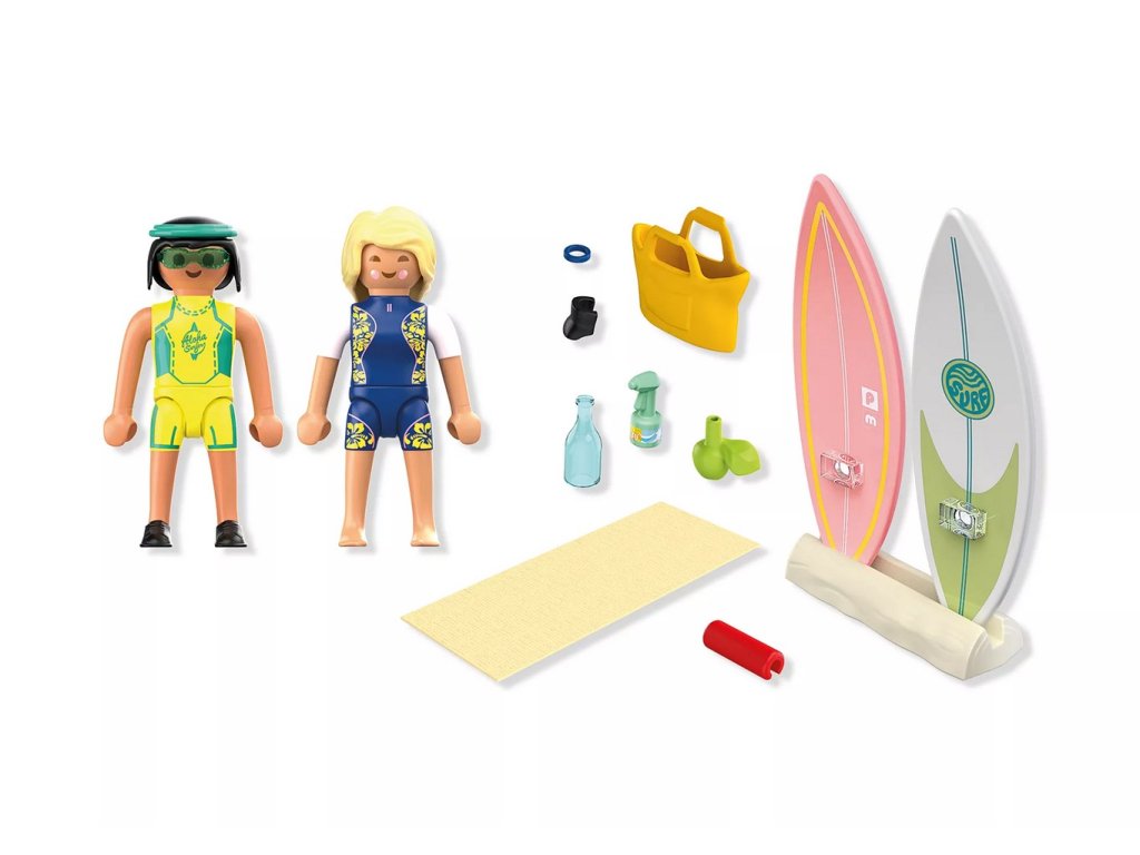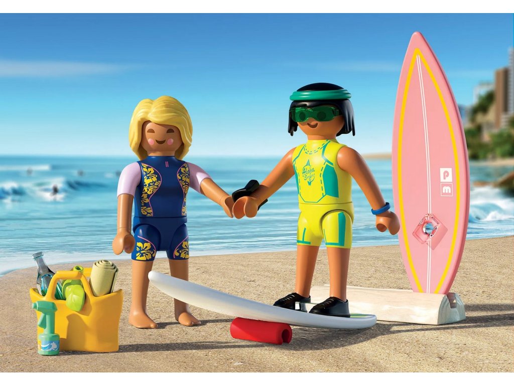 Obsahuje: 1 muž se slunečními brýlemi a čelenkou, 1 žena, 2 surfová prkna, 1 držák na surfové prkno, 1 váleček na trénink surfování, 1 plážová taška s ručníkem, opalovacím krémem a láhví