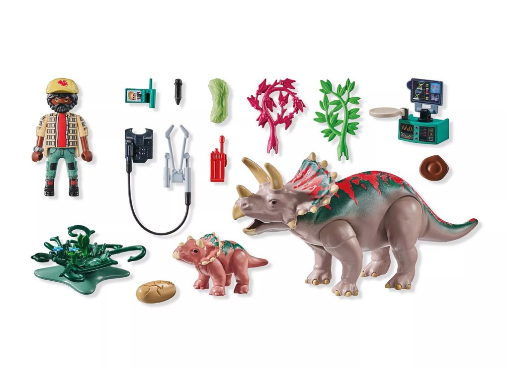 Obsahuje: 1 muž, 1 Triceratops, 1 mládě Triceratopse, 1 travnatá plošina s hnízdem, 2 malé listy, 2 větve, 2 květiny, 1 vysílačka, 1 vejce, 1 přístroj s obrazovkou, 1 pero, 1 přístroj na záda s kleštěmi, 1 kšiltovka, 1 náramkové hodinky