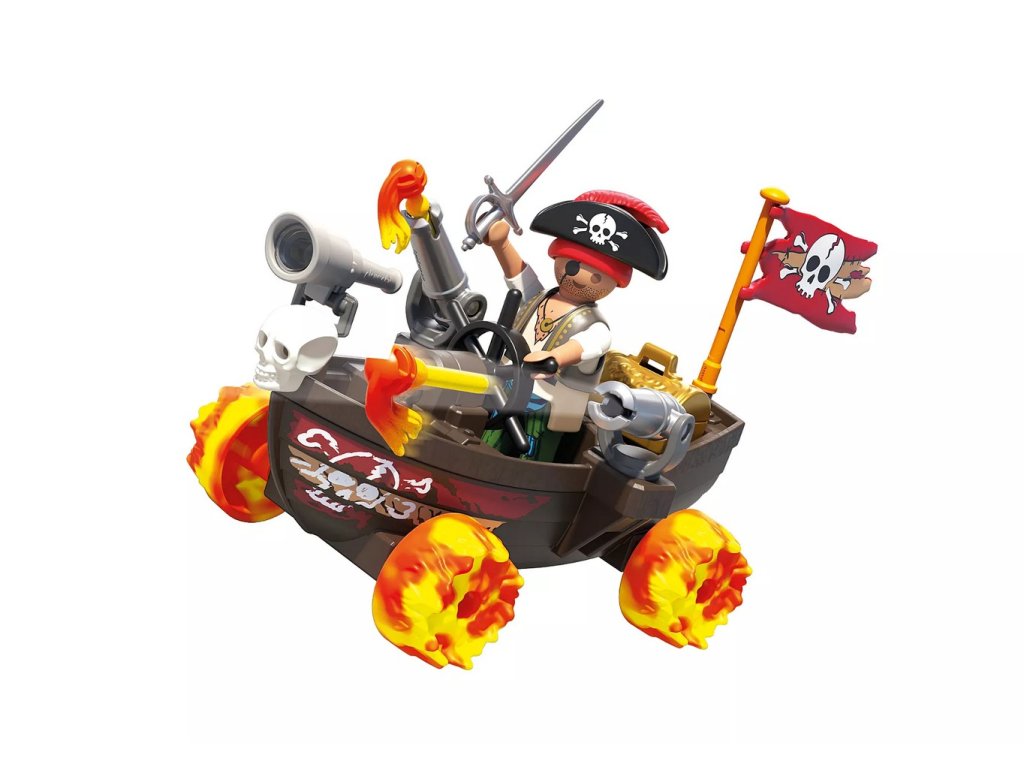 Obsahuje: 1 muž, 1 motokára pirátská loď, 2 ohnivé střely, 1 truhla s pokladem, zlaté mince, 1 dalekohled, 1 kotva, 1 lebka, 1 vlajka, 1 pirátský klobouk, 1 meč