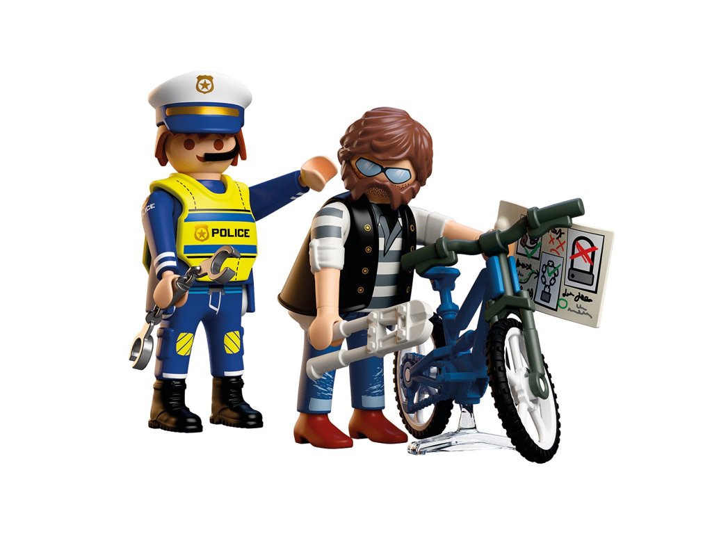 Sada obsahuje policistu, zloděje, kolo, policejní čepici, mapu a zámek na kolo, který lze také použít jako pouta pro zloděje.