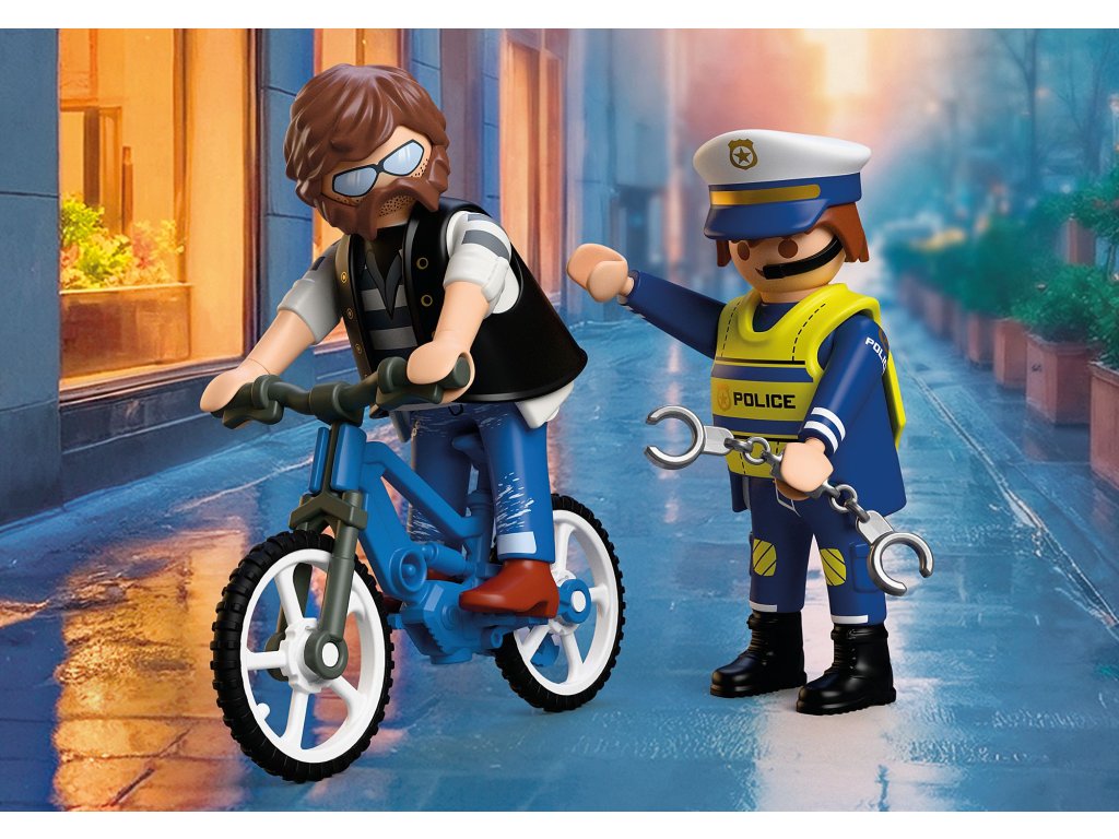 Obsahuje: 1 policista, 1 zloděj, 1 policejní helma, 1 jízdní kolo, 1 pouta/zámek na kolo, 1 štípačky, 1 mapa